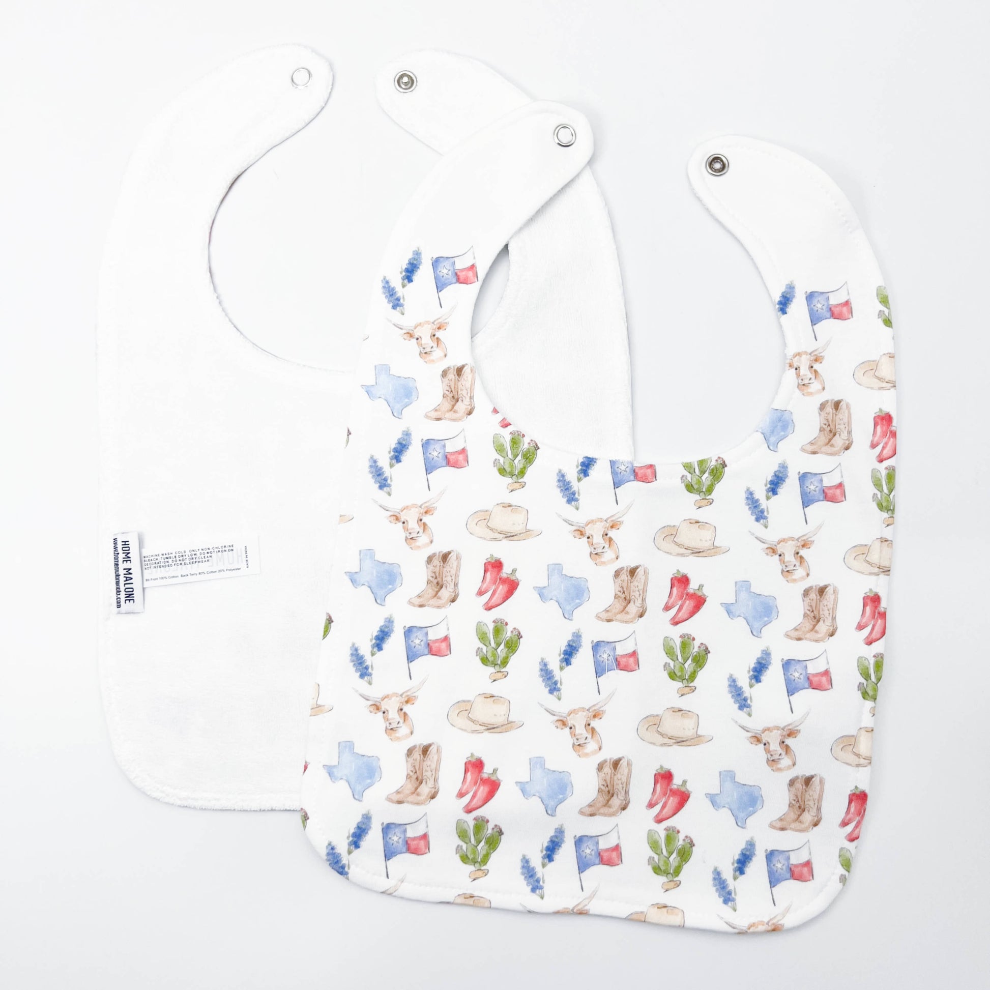 Yeehaw! Add a little Lone Star pride to mealtime with this Texas State Icons Baby Bib, featuring a playful all-over print of iconic Texas favorites. From cowboy boots and longhorns to bluebonnets, peppers, cacti, and the Texas flag, this bib captures the heart and heritage of the great state of Texas.