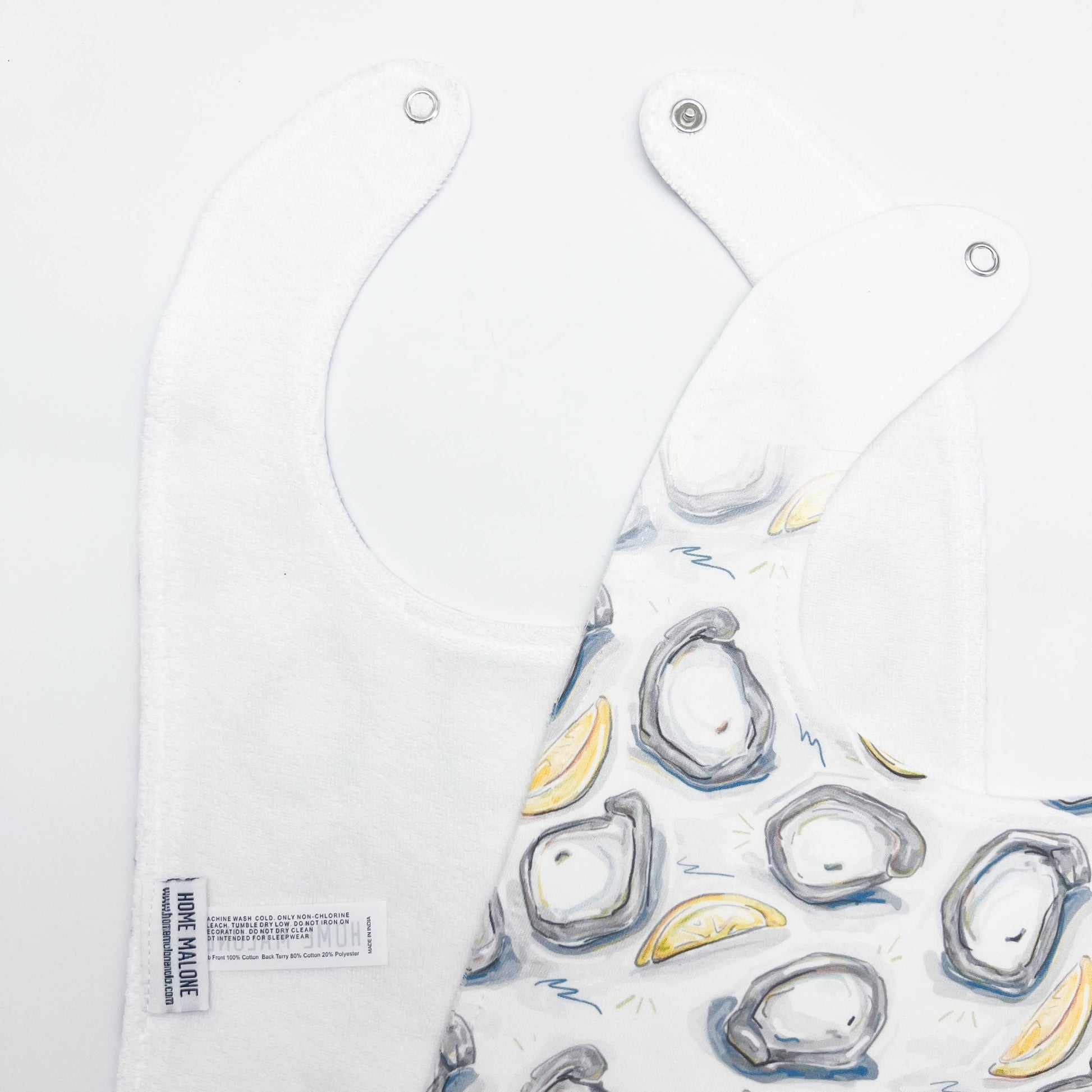 Oysters on the half shell with a squeeze of lemon are a way of southern life during the months that have an "r". A cute baby bib for that coastal baby.