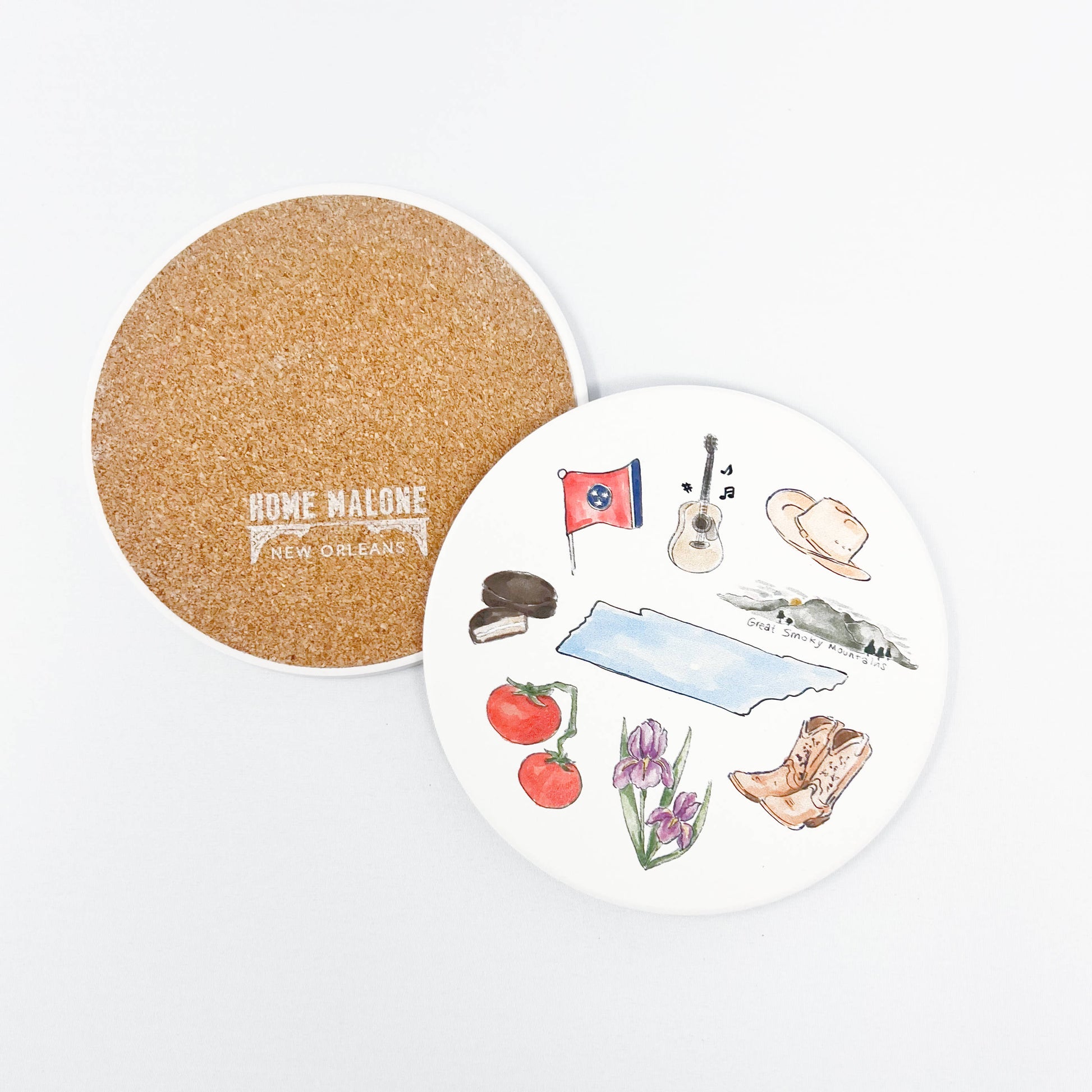 Show off your Volunteer State pride with this Tennessee Icons Stone Coaster, a charming tribute to the culture, nature, and heritage of Tennessee. Set against a fresh white background, this absorbent stone coaster features a thoughtfully illustrated mix of Tennessee favorites — from Country Music, Moonpies, Iris Flowers, Tomatoes, Great Smoky Mountains, Cowboy Boots and Hat to and the iconic state flag.
